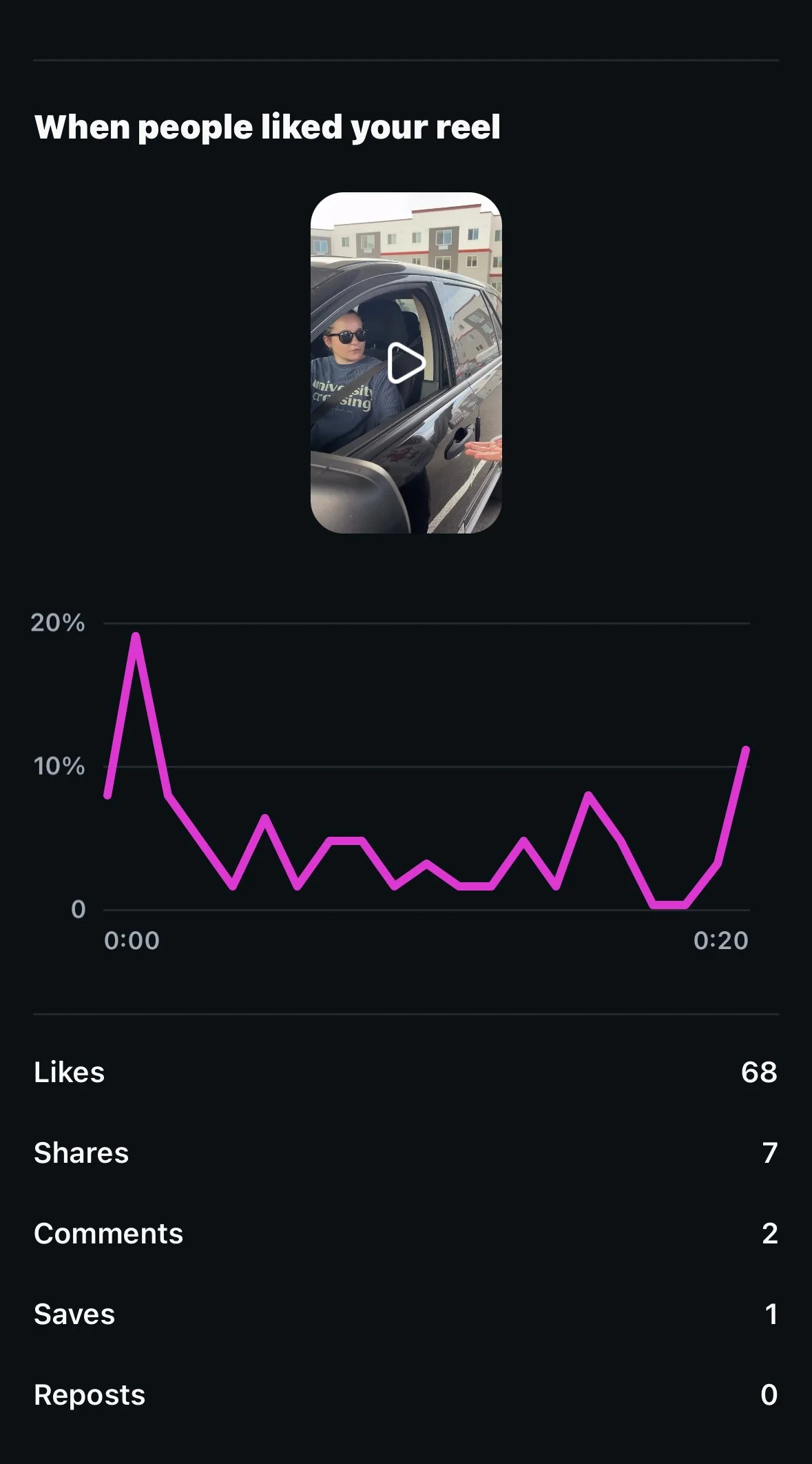 Highlights: This reel had a lower skip rate than our average, and it was shared seven times. It also received over 2,500 views across Instagram and Facebook.