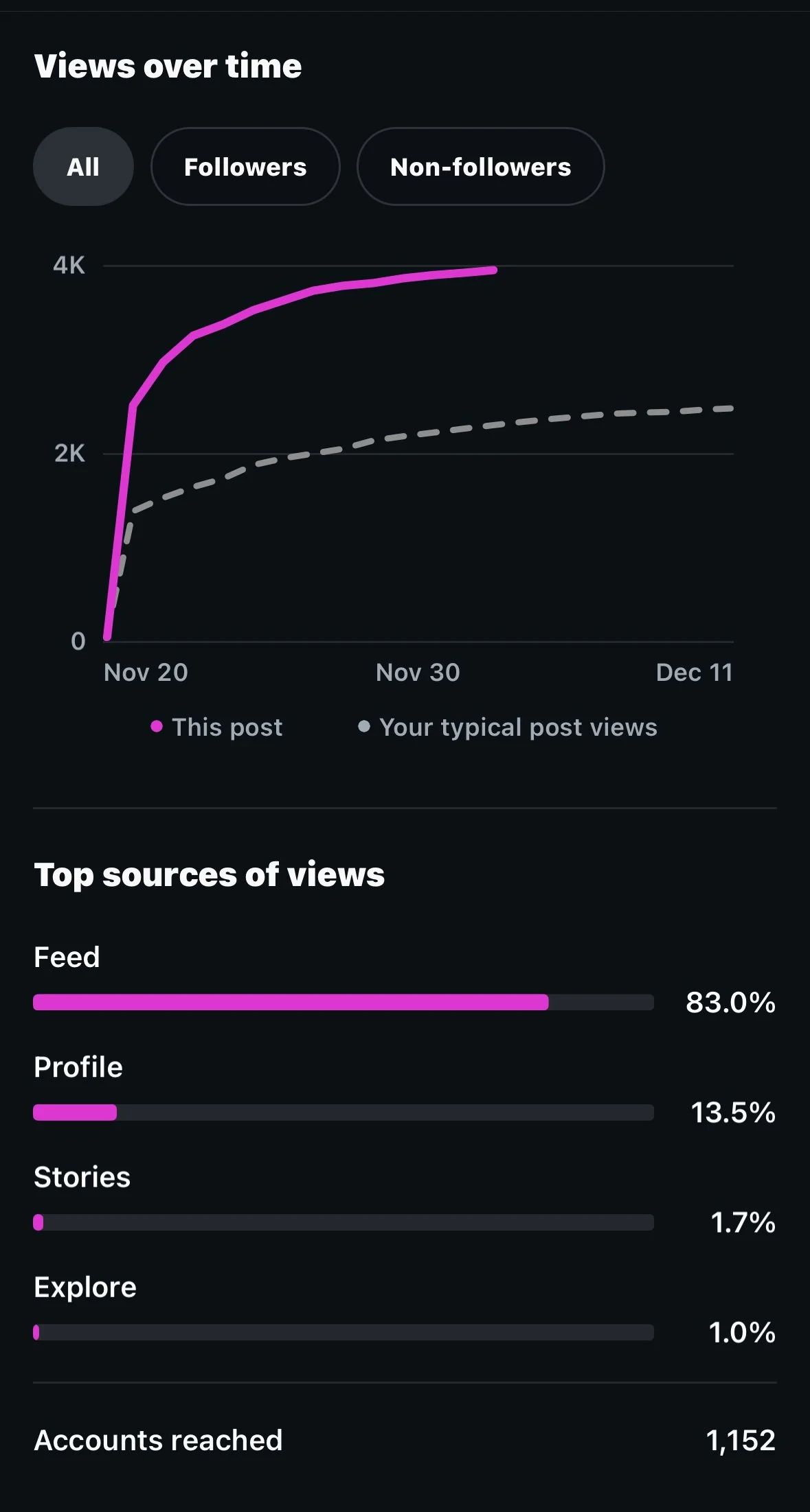 Highlights: This post gained almost 4,000 views on Instagram and over 100 interactions. It also had much higher views over time than our average post.