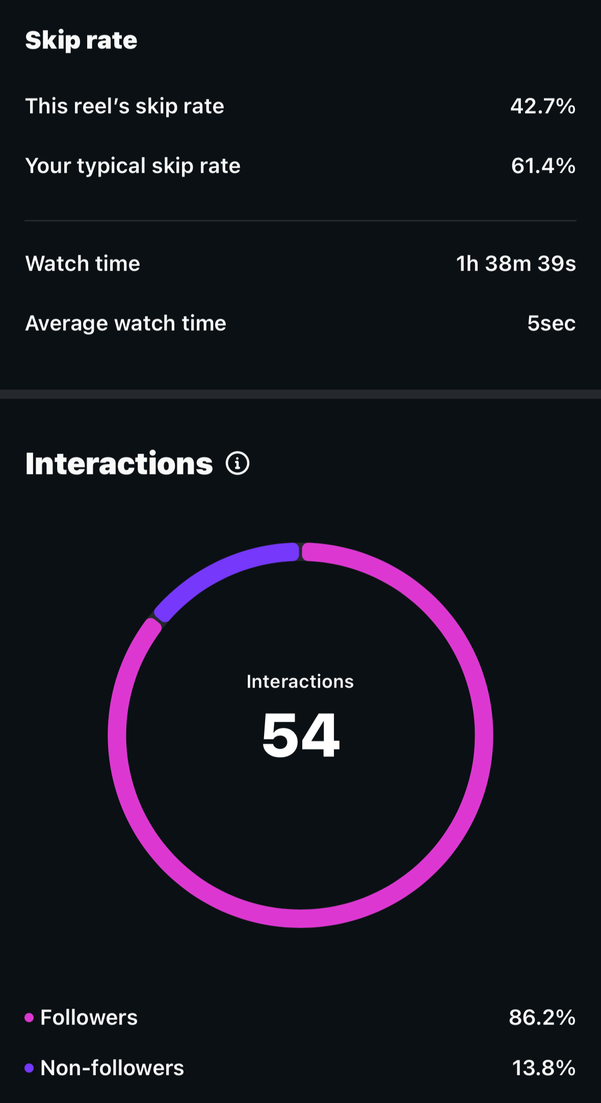 Highlights: This reel had a lower skip rate and a higher views over time than our average. It also received over 1,600 views across Instagram and Facebook.